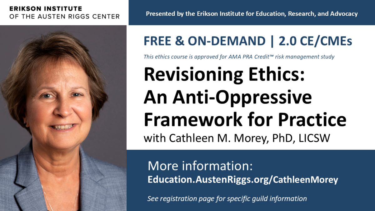 The Erikson Institute for Education, Research, and Advocacy of the Austen Riggs Center is pleased to provide online continuing education (CE) / continuing medical education (CME). CE/CME credit is provided through video/audio courses with an emphasis on biopsychosocial, psychodynamic and systems approaches to treatment. CME/CE certificates are provided upon completion. Credit is available for those with an MD, DO, PhD, PsyD, and social workers at this time. All mental health professionals and students are welcome to experience course offerings and can be provided with a certificate of completion. As a registered member of this educational platform, your courses and transcripts are available on demand. REGISTER to have access to courses. Check back to see new course offerings and thank you for browsing.